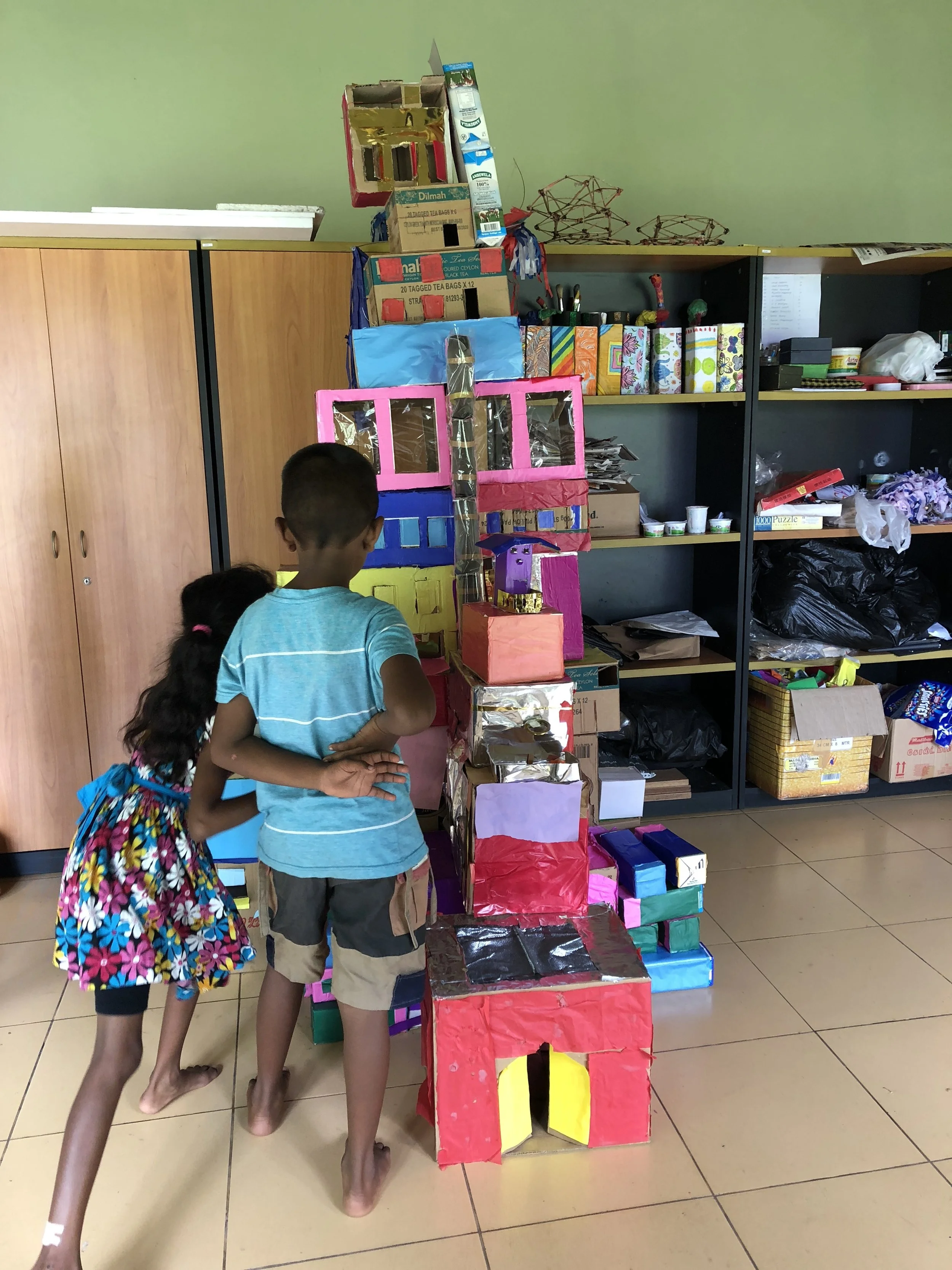 For the rest of the day, we were meant to finish last weekend’s cardboard tower - an easy exercise made more challenging by the absence of the older students - who were playing at the cricket match. We started off by stacking the tower into its tallest form and critiquing it. It was the first time everyone saw the tower in its full height, so we hoped that would be incentive to keep going. Due to arguments we had associated with the assigned 3 groups - we decided to hand over a box per student to decorate - and asserted this responsibility by writing each students name on a box with a marker. I really wish we didn’t have to do this- as we didn’t want to undermine teamwork- but it became difficult with younger children in the absence of their group ‘elders’. We also realized that the younger kids may have been getting the ‘work’ done by the older kids and not getting much done themselves.. (Honestly- quite a smart move, little fellas!) I made a note to self that some of these kids felt like the project was dragging on too much, and some wanted the boxes to finish fast because it felt like ‘work’.