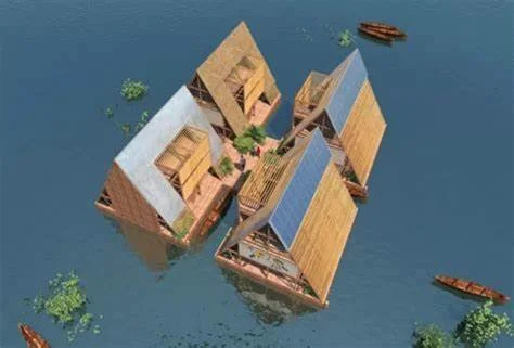Show images/videos of floating communities and compact designs (airplanes, boats).