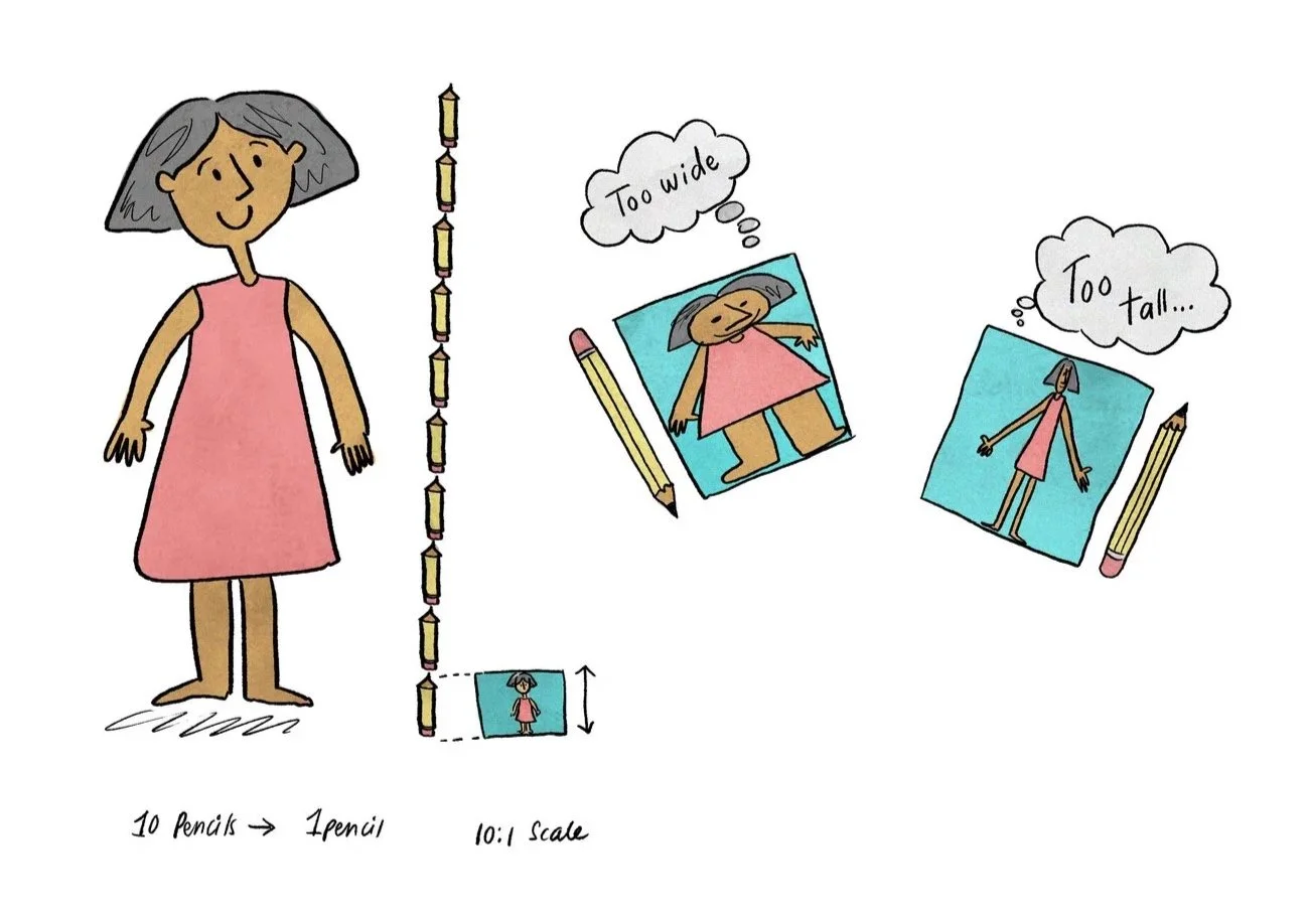 Grab your sketchbook or paper. If you measured your friend using pencils, draw them only one pencil tall. If you measured your friend using hands, draw your friend on a piece of paper so they are just one hand tall.