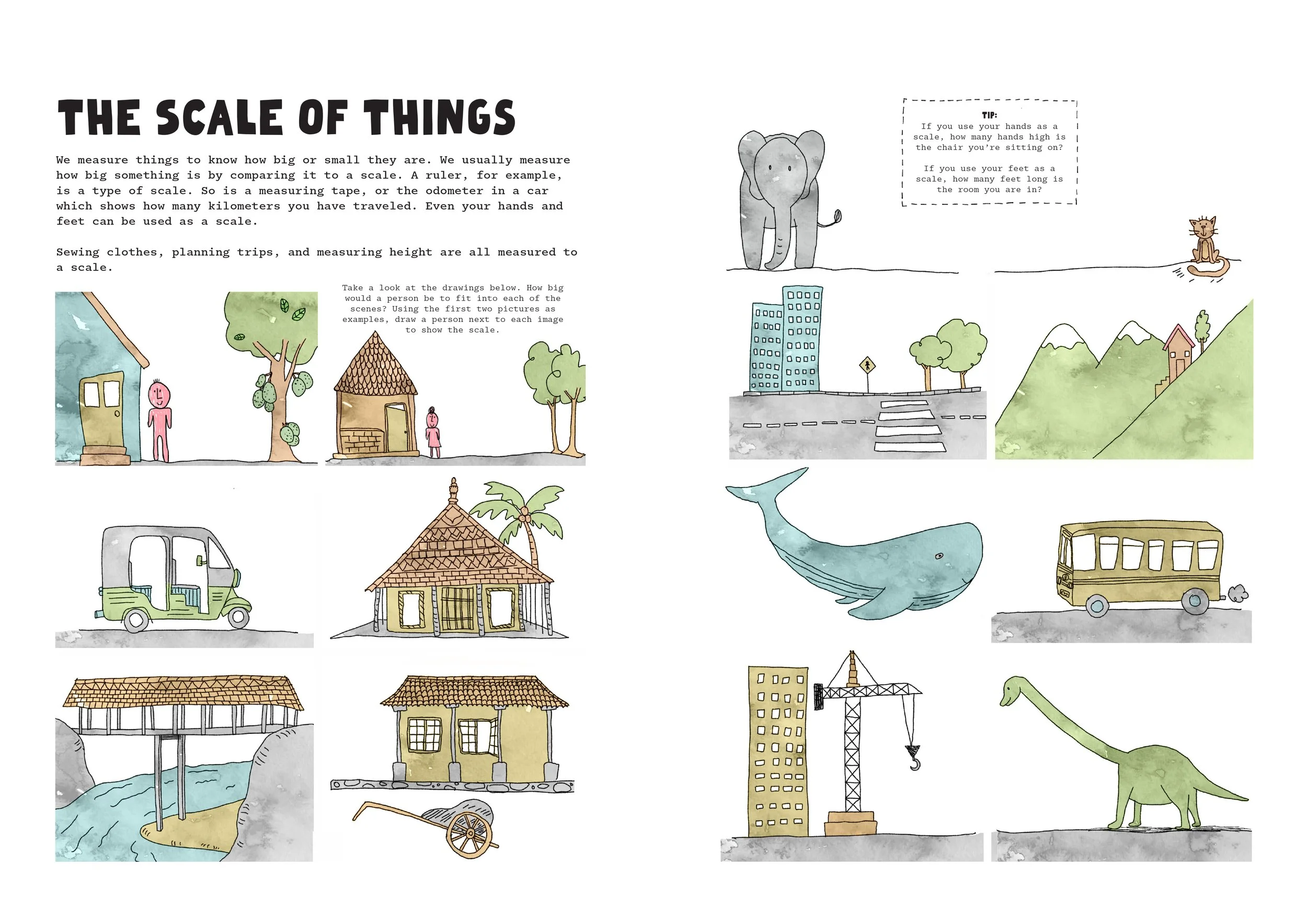 Look at these pictures. (the below image should be made available as a printed handout) How big is a person next to this house? Or this elephant? Or this cat? Or even an ant? Draw a stick figure next to it to demonstrate how big or small the image next to it is.